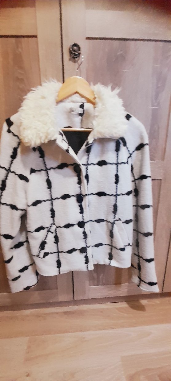 Beyaz ve gri tonlarda, kürk detaylı yakalı ve batik desenli uzun kollu, normal boyda, bol kesim rahat kumaş ceket.