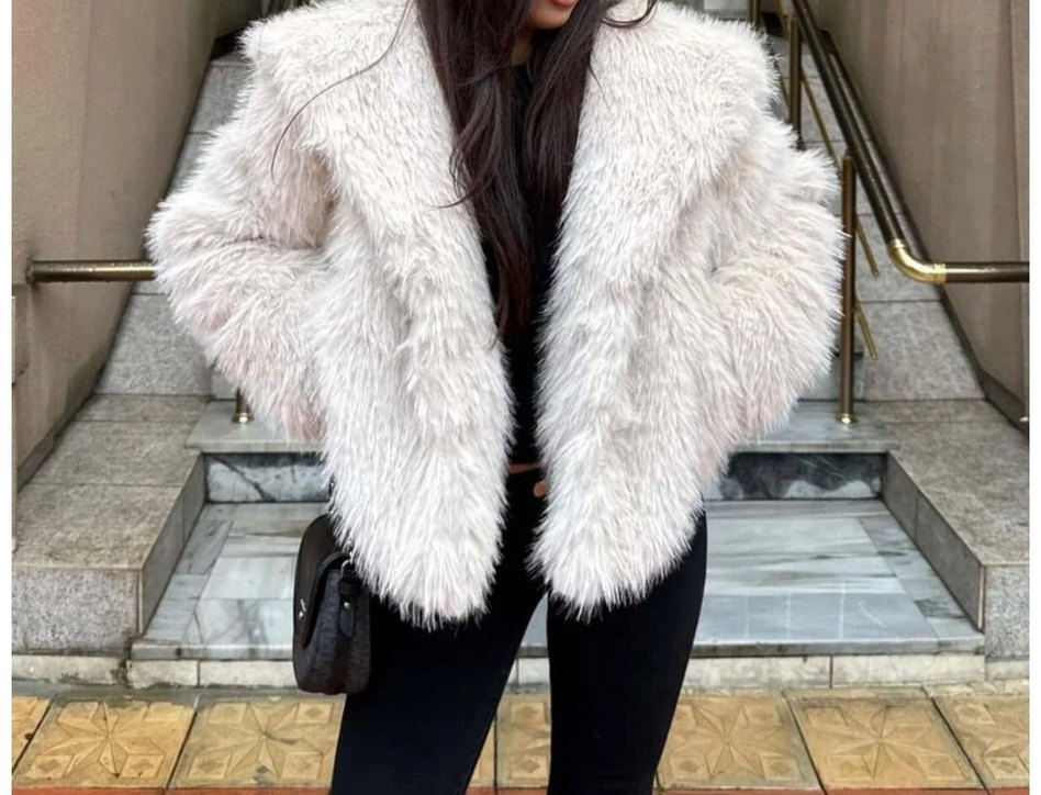 Uzun kollu, beyaz kürk detaylı, normal boy midi kesim, suni kumaştan yapılmış, sokak stiline uygun kadın mont.