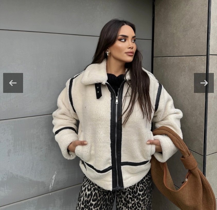Kadınlar için bol kesim, kısa boy beyaz kürklü ceket. Uzun kollu, bisiklet yaka ve gri tonlarda zebra desenli, rahat sokak stili için uygun.