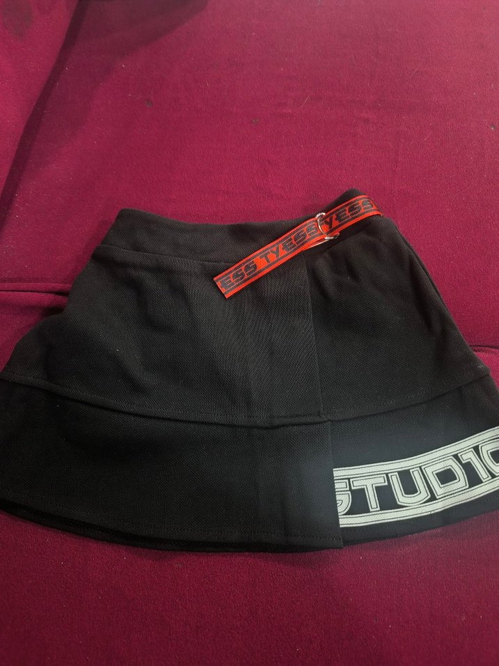 Sentetik kumaştan yapılmış, baskılı detaylı ve tokalı, dar kesim siyah mini etek. Sokak stili için uygun.