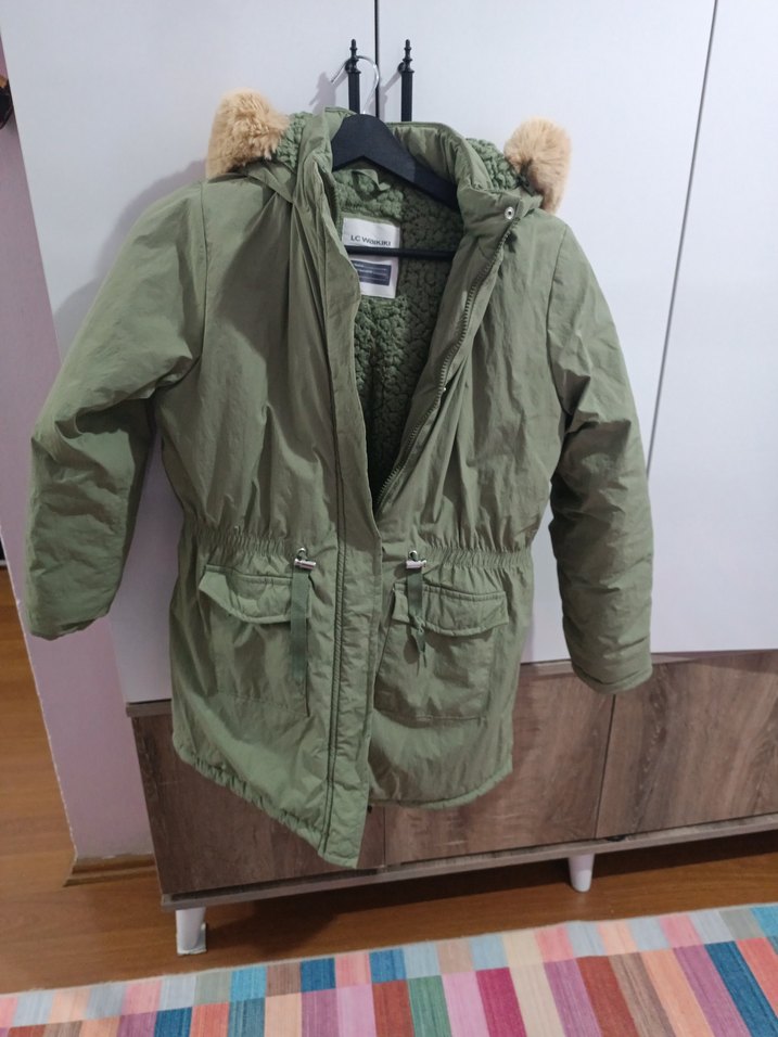 Fermuarlı, kürklü kapüşonlu, yeşil ve gri kamuflaj desenli, diz boyu çocuk kaban. Yumuşak polar kumaştan, uzun kollu ve sokak stiline uygun. yagmur gecirmez.