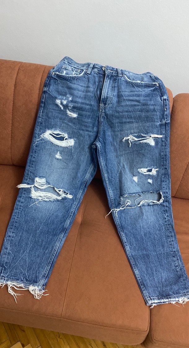 Bol kesim, yırtık detaylı denim pantolon, günlük rahat kullanım için uygundur.