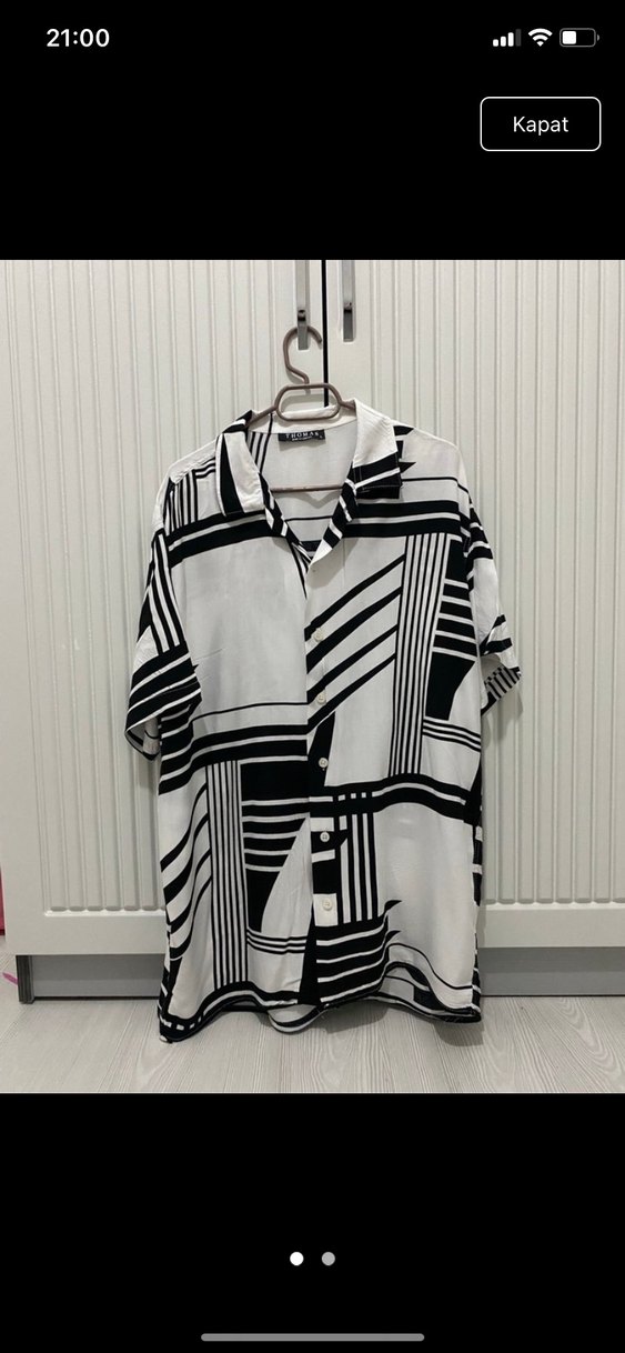 Gevşek kesim, kısa kollu erkek gömleği, tekne yaka ve düğmeli. Siyah beyaz zebra desenli, sentetik yumuşak kumaştan. Sokak stili ve günlük kullanım için uygun.