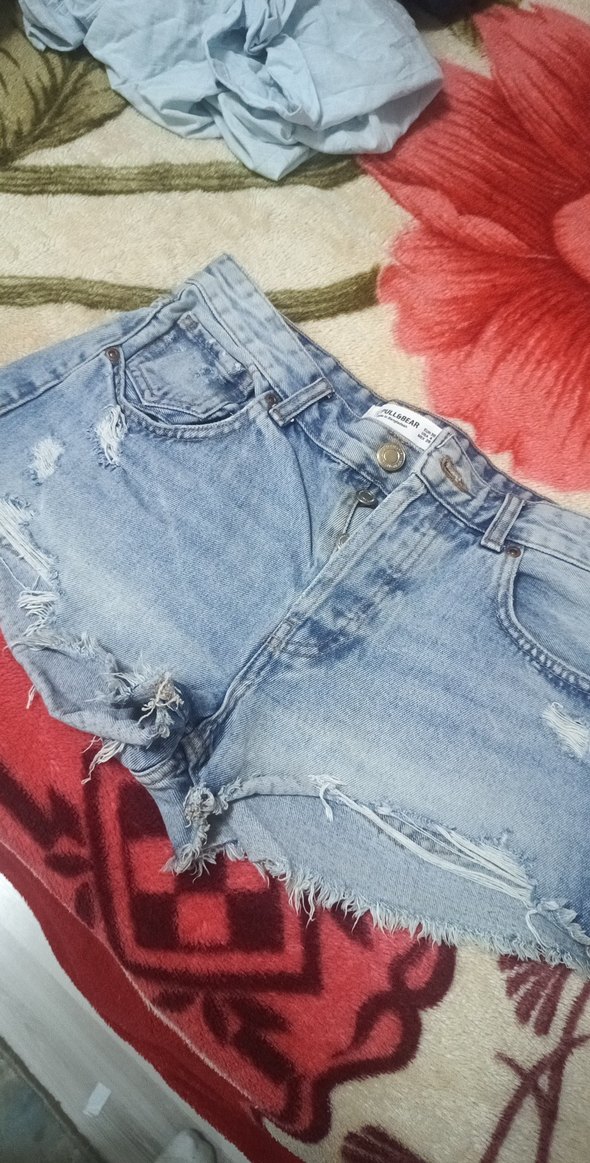 Gevşek kesim, soluk gri-mavi renkte, tokalı ve yıpratılmış detaylı mini kot şort, günlük sokak stili için uygun.