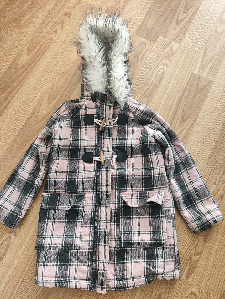 Pembe ve gri ekoseli, bol kesim kız kabanı. Yumuşak ve sıcak kumaş, kürklü kapüşon ve iki ön cep bulunur. Sokak stiline uygun rahat kullanım sağlar.