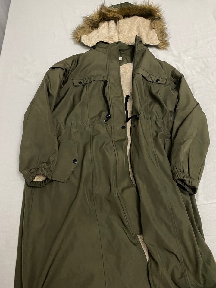 Haki renkli, uzun kesim, bol kalıp kadın mont. Kapüşonunda kürk detayları ve yumuşak iç astar bulunur. Uzun kollu, çıtçıtlı ceplidir.