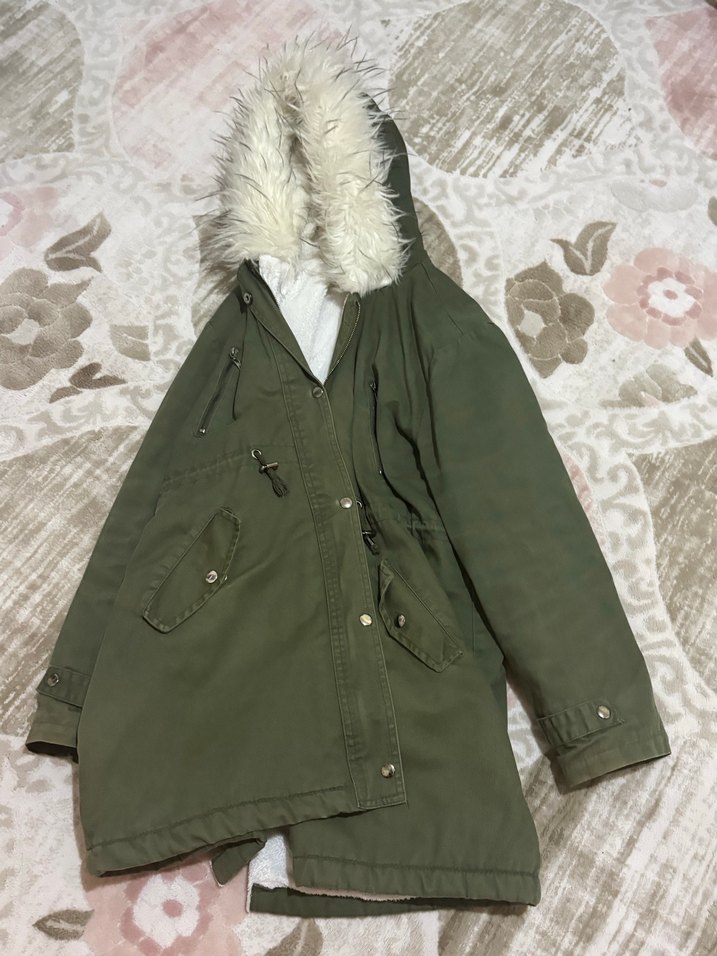 Yeşil renkli, kürklü kapüşonlu, bol kesim kadın kaban. Uzun kollu, yumuşak ve sıcak kumaştan, günlük kullanıma uygun midi uzunlukta, desensiz sokak stili kaban.
