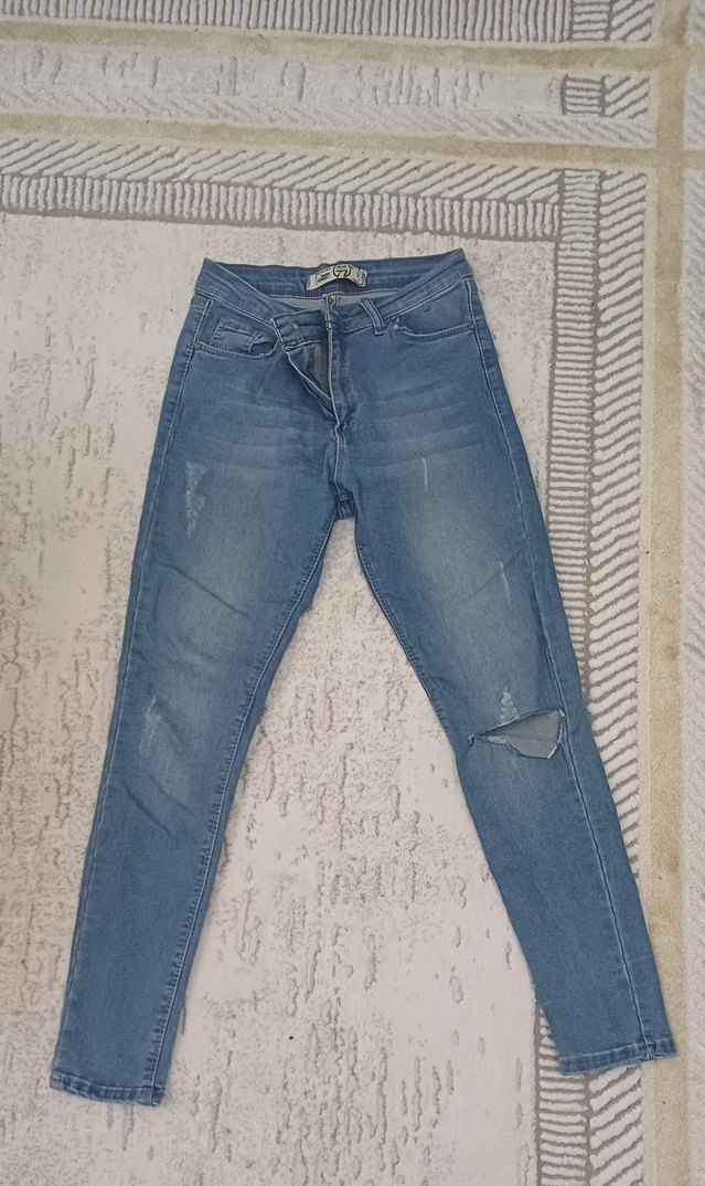 Midi boy, yırtmaç detaylı, mavi renkli slim fit kot pantolon. Günlük sokak stili için uygundur.