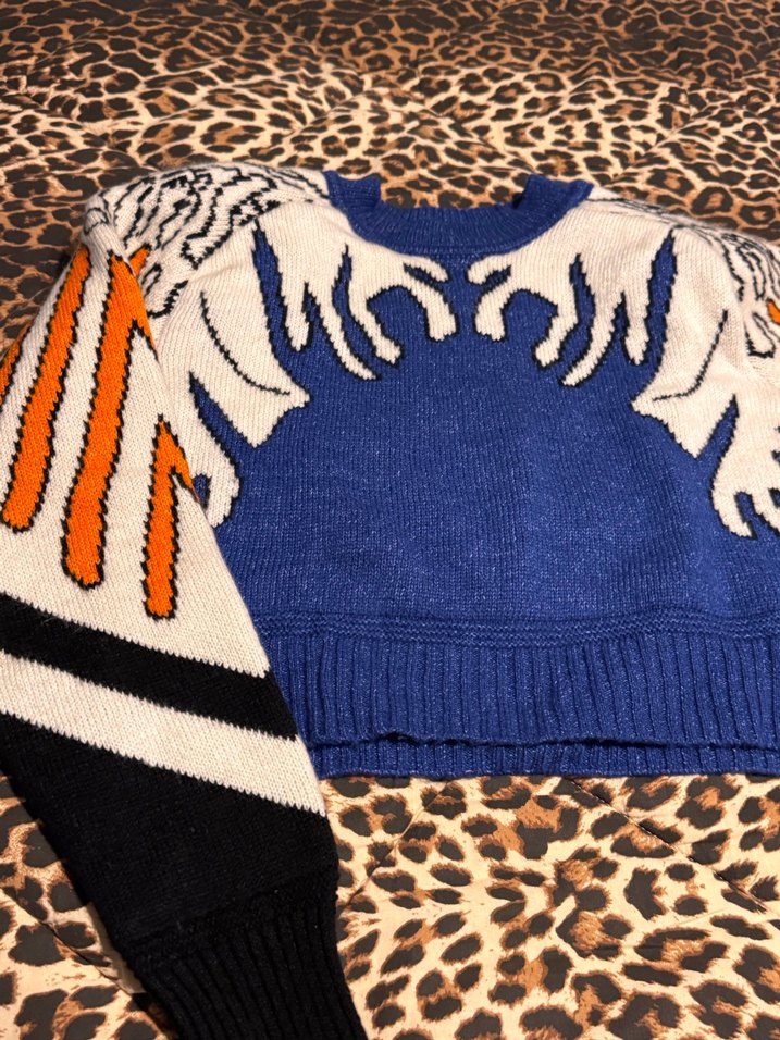 Dar kesim, koyu mavi triko kumaşlı, yuvarlak yakalı ve uzun kollu kadın kazak. Avangart zebra desenli, rahat sokak stili için uygundur.