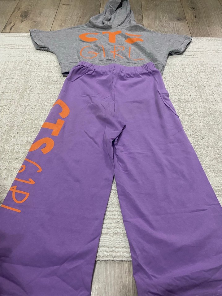 Gri kısa kollu kapüşonlu pamuklu sweatshirt ve mor baskılı bol kesim eşofman altı, sokak stilini yansıtır. Rahat ve şık.