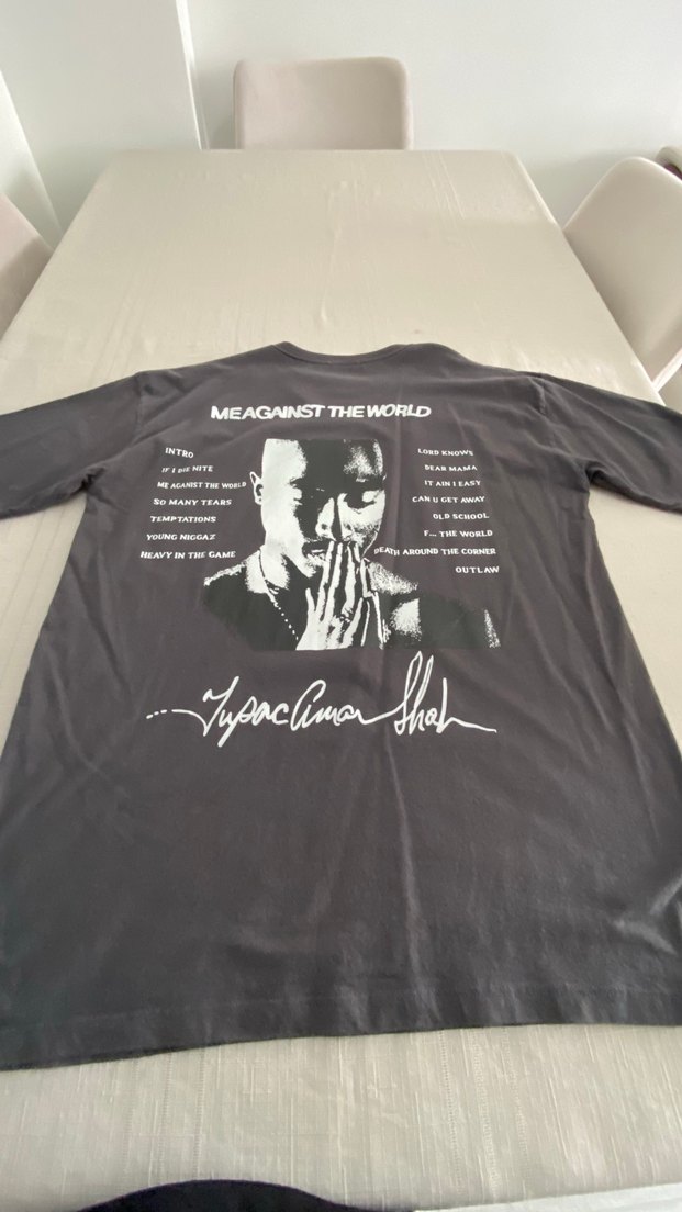 Siyah baskılı, gevşek kesim, kısa kollu erkek tişörtü. Sentetik kumaştan, grunge punk tarzı için 'MEAGAINSTTHEWORLD' yazılı grafik detaylı.