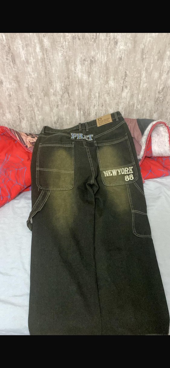 Siyah kot pantolon, bol kesim ve normal boyda. Baskılı detaylar ve kemerli bel tasarımıyla sokak stiline uygun, günlük rahat kullanım için ideal.