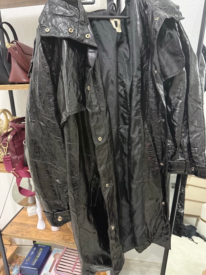 Siyah deri, bol kesim midi yağmurluk. Strappy kollu, çıtçıtlı ve kemerli detaylara sahip. Notch yaka, sokak stili için ideal.