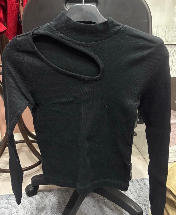 Siyah renkli, uzun kollu ve normal midi boyda, belden oturan, yakasında tokalı kesim detayı bulunan kadın kazak. Günlük kullanım için uygundur.
