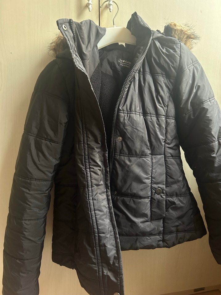 Dar kesim midi boy siyah kadın mont, kürk detaylı ve yakası kesik. Yumuşak sentetik kumaş, uzun kollu, rahat sokak stili.