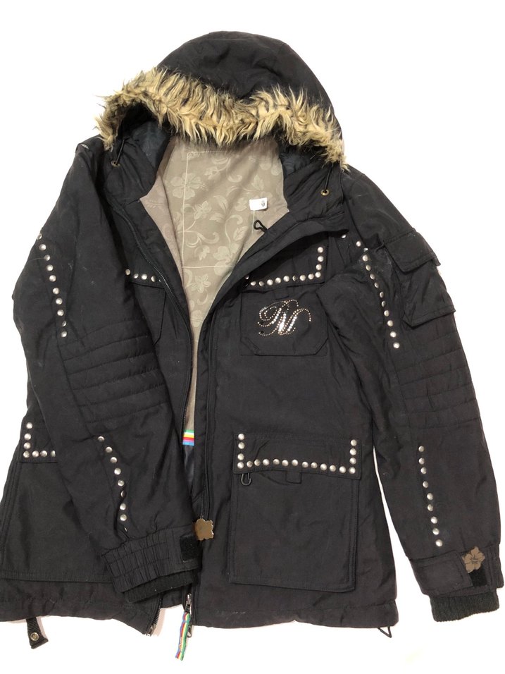 Siyah, kürklü kapüşon ve çivili detaylara sahip, uzun kollu, normal boy sokak stili kadın montu.