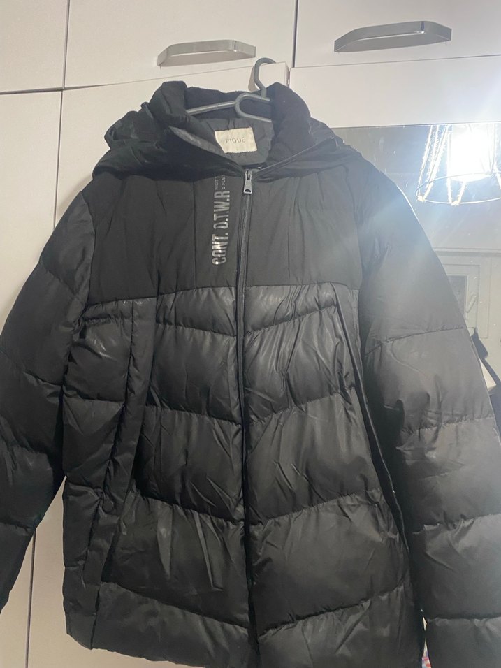 Bu siyah, midi uzunlukta, şişme kaban yüksek yakalı ve uzun kolludur. Yumuşak ve sıcak kumaştan, sokak stili için uygun şişme tasarıma sahiptir.