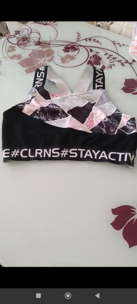 Siyah mini spor sütyeni, baskılı desen ve kalın elastik askılar üzerinde 'E#CLRNS#STAYACTI' yazısı ile sokak stilini yansıtır.
