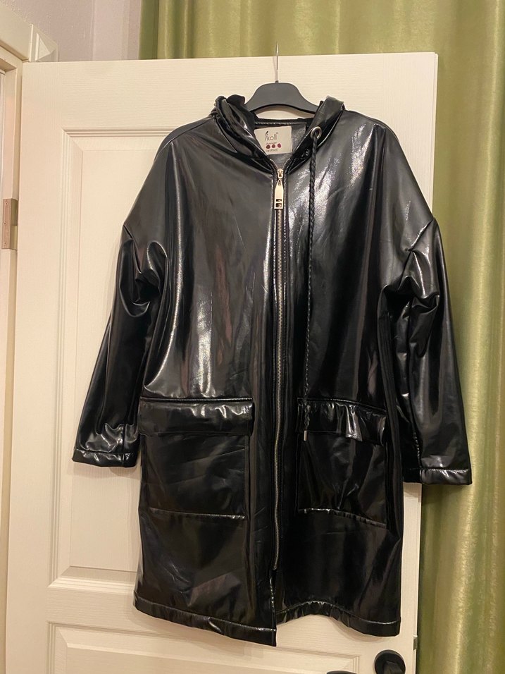 Siyah, parlak deri yağmurluk, notlu yaka ve uzun kolludur. Midi boyda, bol kesimdir ve sokak stiline uygundur. ️ölçüler eklidir