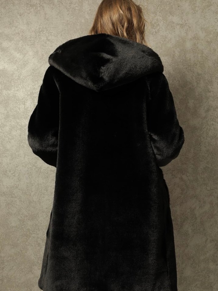 Sokak Stili Uzun Siyah Kürk Detaylı Kapüşonlu Kadın Mont