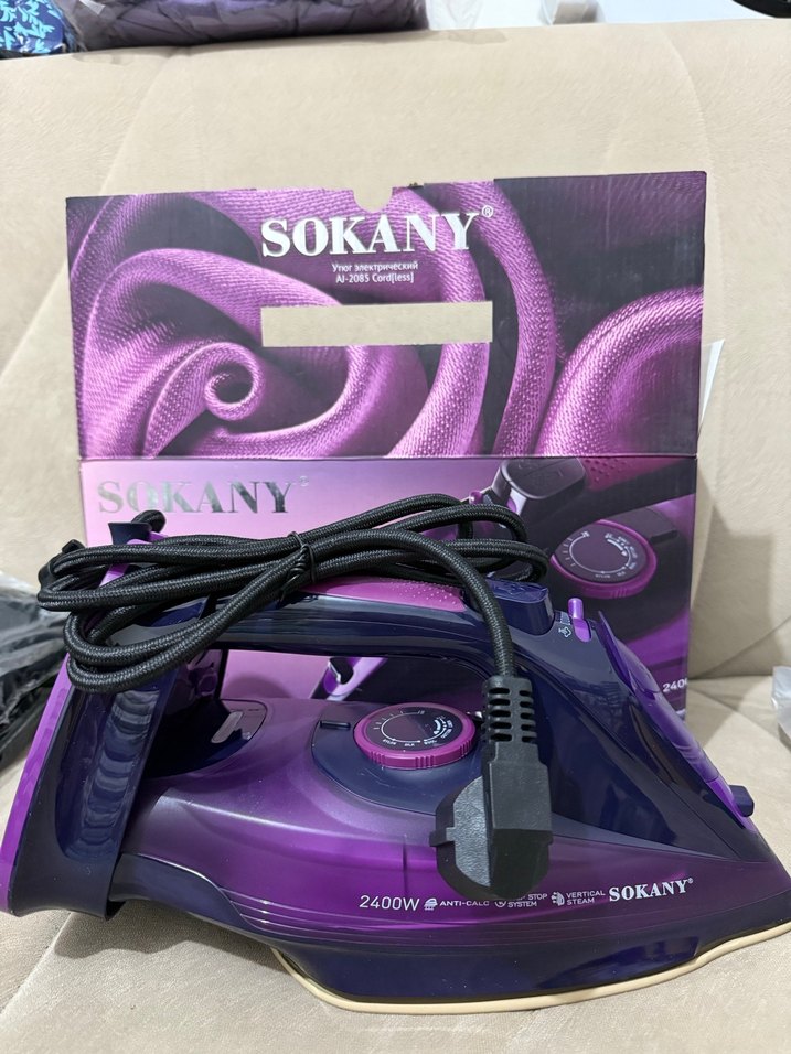 Sokany markalı koyu mor ütü, 2400W güçlü ısıtma ve ayarlanabilir sıcaklık kontrolü ile pratik kullanım sağlar. Kireç önleyici özellik içerir.