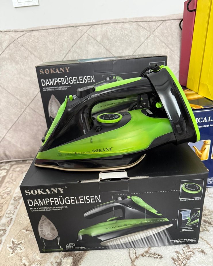Sokany yeşil buharlı ütü, ayarlanabilir sıcaklık kontrolü ve buhar fonksiyonuna sahiptir. Şık koyu tasarımı ve rahat tutma yeri bulunur.