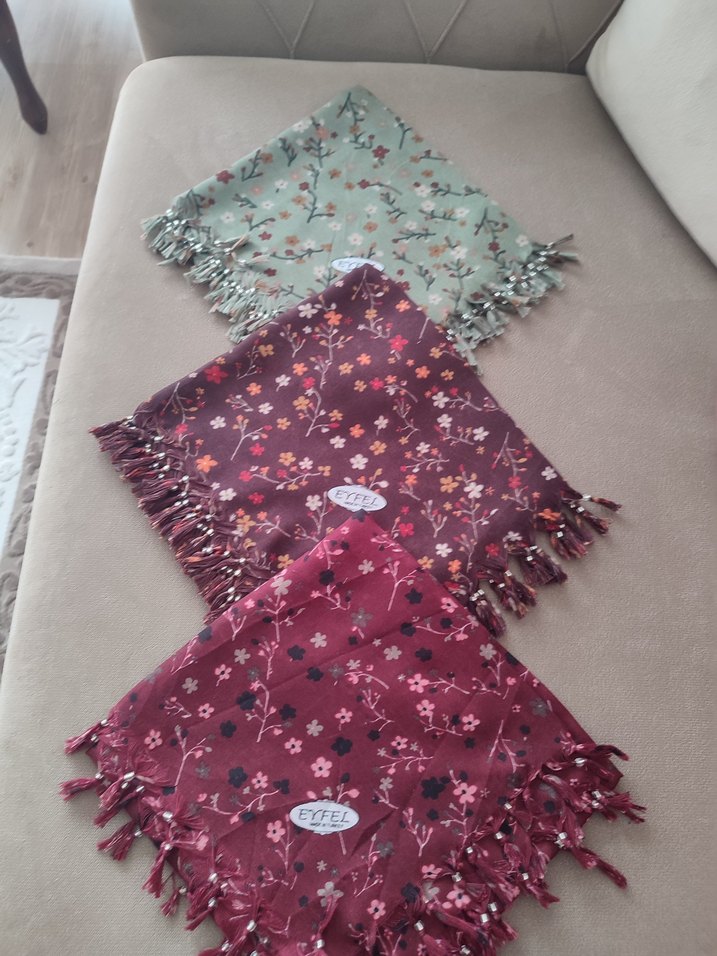 Üçlü set bohem tarzda, koyu renkli çiçek desenli ve püsküllü kadın fuları. Yumuşak tekstil malzemeden yapılmıştır, canlı bir görünüm katar.