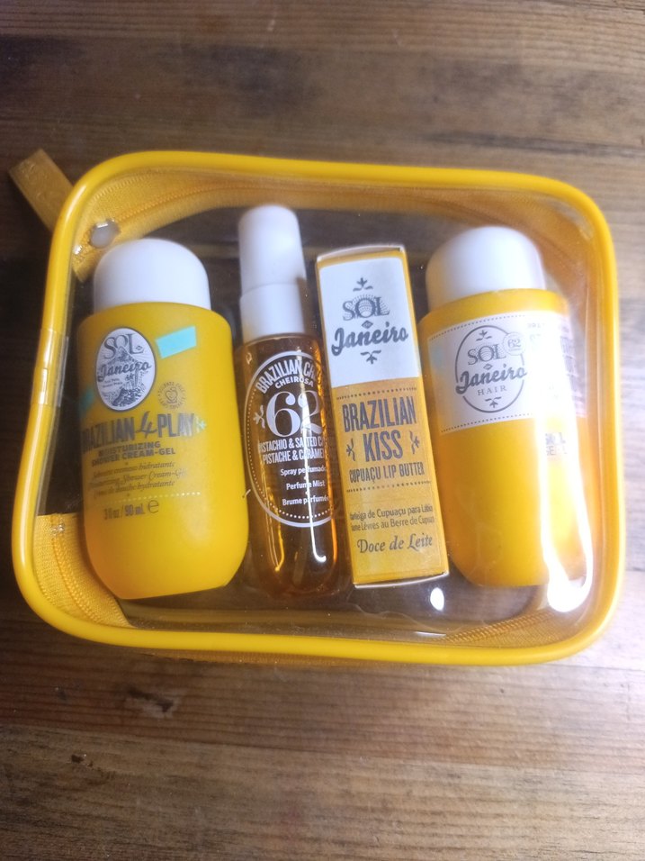 Sol de Janeiro cilt bakım seti, temizleyici jel, yüz yağı ve nemlendirici içerir, sarı seyahat çantasında sunulur.