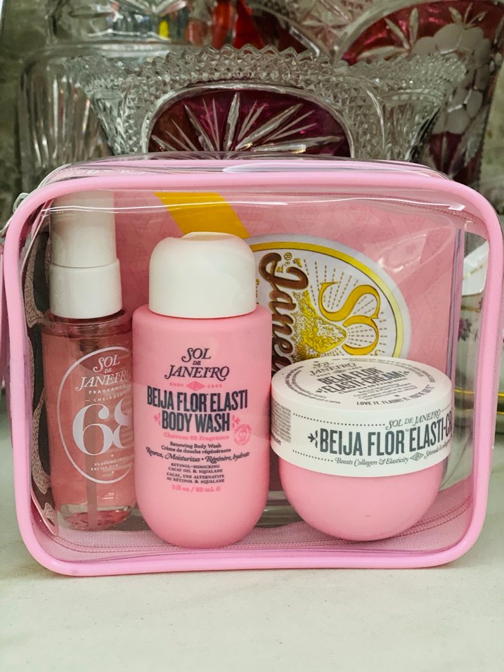 Sol Janeiro Beija Flor Elastik vücut yıkama jeli, krem ve sprey içeren şeffaf pembe çantalı vücut bakım seti. İADE YOKTUR . #hediyeseti #parfüm #ciltbakımı