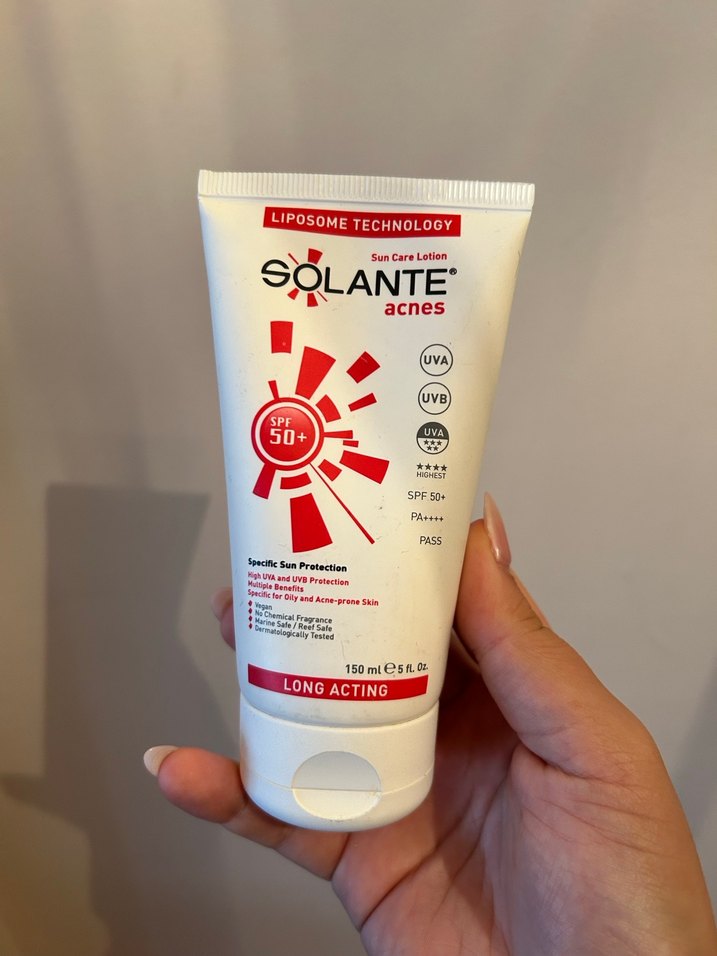 Solante Acnes güneş koruyucu losyon, yağlı ve akneye meyilli ciltler için uzun süre etkili SPF 50+ koruma ve liposom teknolojisi sunar.