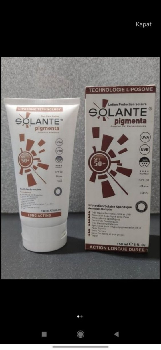 Solante Pigmenta güneş koruyucu, SPF 50+ ile uzun süreli UVA ve UVB koruması sağlar. Liposom teknolojisiyle etkili bakım sunar, yağlı his bırakmaz. Hassas ciltler için uygundur. ☀️