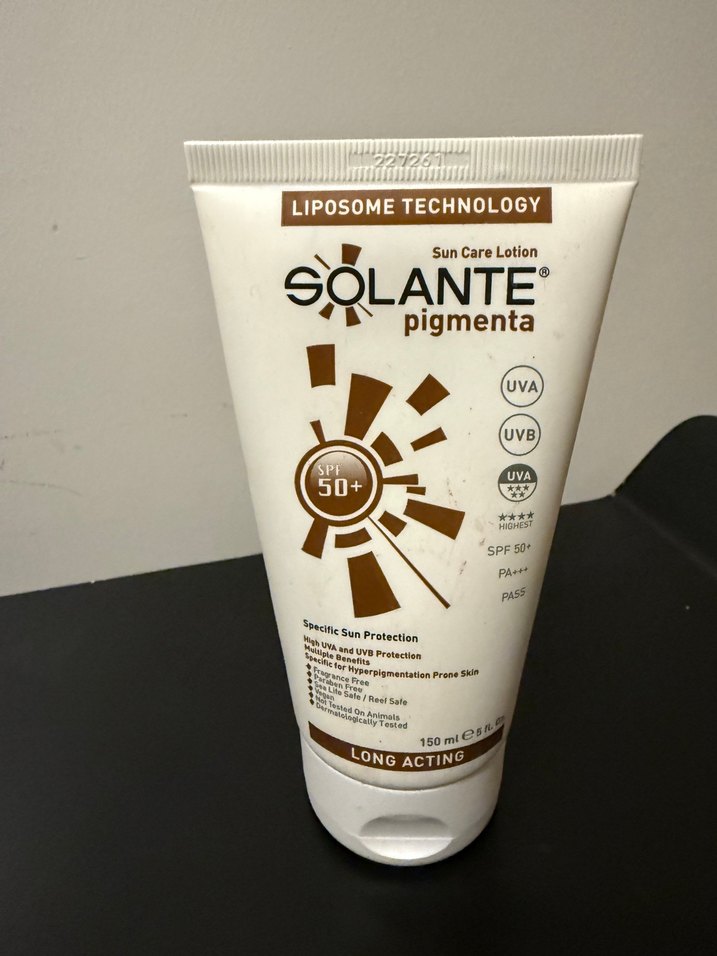 Solante Pigmenta güneş koruyucu losyon, SPF 50+ ve liposom teknolojisi ile geniş spektrum UVA ve UVB koruması sağlar. Uzun süre etkili, pigmentasyona karşı koruyucudur. 150 ml tüp görselde görebilirsiniz içinde ne kadar kaldı