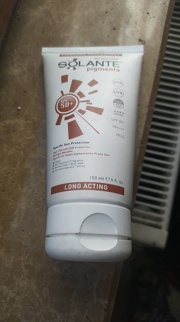 Solante Pigmenta, SPF 50+ ve PA++++ koruması ile UVA, UVB ve UVC ışınlarına karşı uzun süreli koruma sağlar. Hiperpigmentasyona eğilimli ciltler için uygundur. Dermatolojik olarak test edilmiştir. orijinaldir 4/1 inden daha az bir miktar kullanilmistir