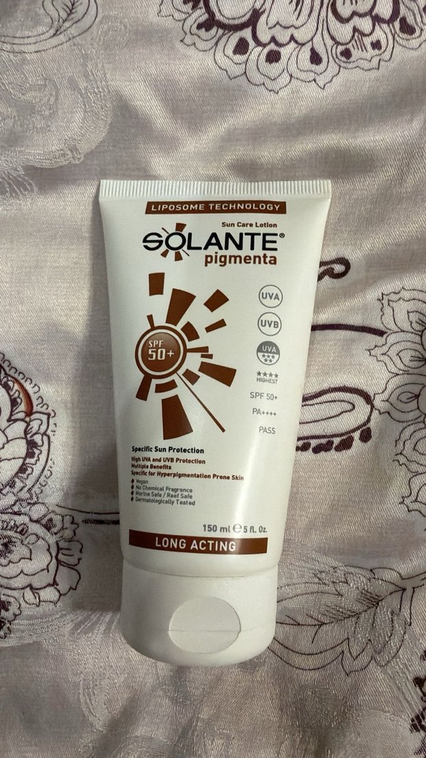 Hiç kullanılmadı, orijinal Solante Pigmenta SPF50+ güneş losyonu, uzun süreli koruma sağlayan liposom teknolojisi ile UVA ve UVB ışınlarına karşı korur. Hiperpigmentasyona eğilimli hassas ciltler için uygundur. 150ml.