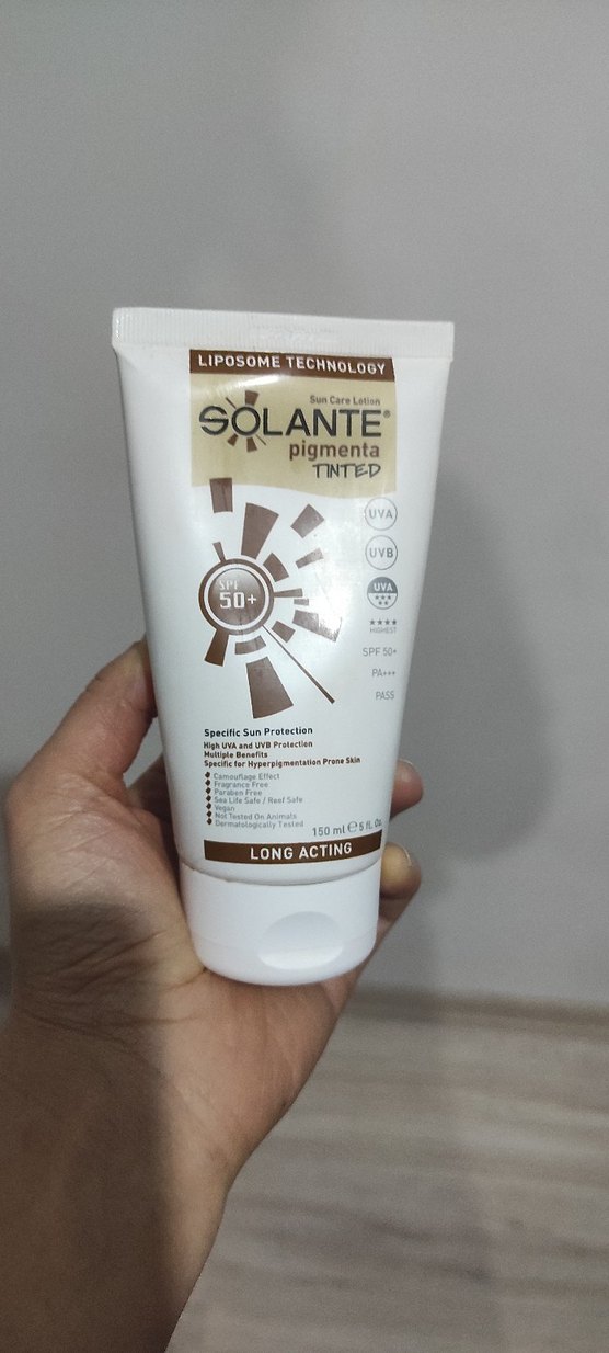 Solante Pigmenta tonlu güneş losyonu, liposom teknolojisi ile uzun süreli SPF 50+ koruma sağlar. UVA ve UVB ışınlarına karşı korur, hassas ve lekeli ciltler için uygundur.