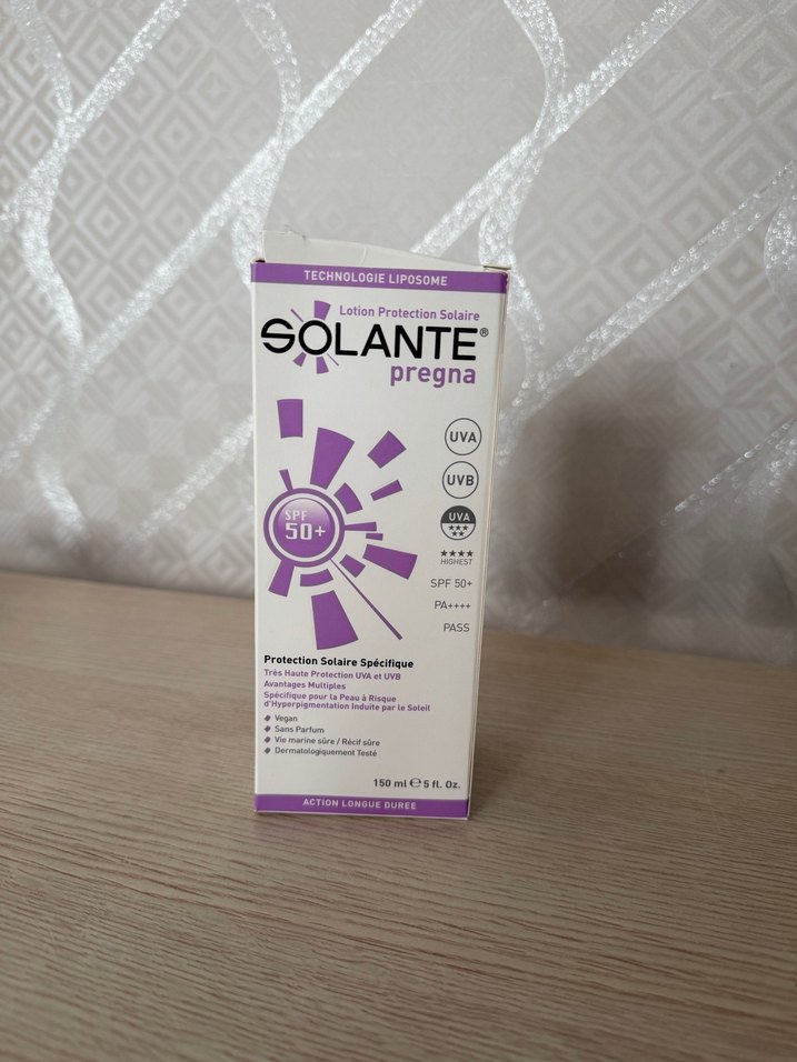 Solante Pregna, SPF 50+ ile UVA, UVB ve UVC ışınlarına karşı yüksek koruma sağlar. Hassas ciltler için uygun, uzun süre etkili 150 ml güneş koruyucu losyon. Işıkta ne kadar kaldığı görünüyor. Gebelik güneş kremi.