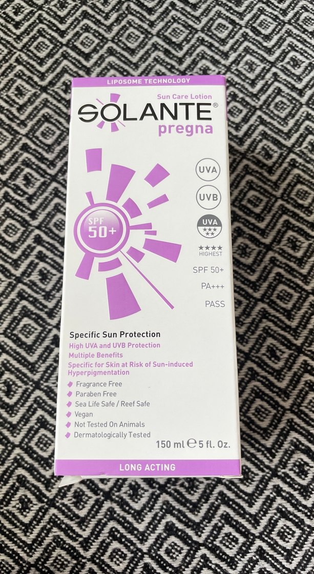 Solante Pregna, SPF 50+ ve PA+++ koruma sağlayan uzun etkili güneş kremidir. Parfümsüz, paraben içermez, vegan olup, güneş kaynaklı hiperpigmentasyon riski taşıyan ciltler için uygundur.Sadece az miktarda kıvamına bakılacak şekilde kullanıldı