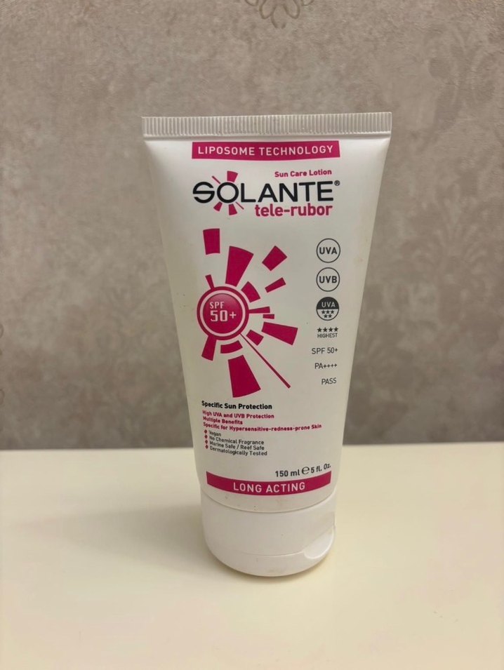 Solante Tele-Rubor güneş koruyucu losyon, uzun süre etkili liposom teknolojisi ile yüksek UVA, UVB ve UVC koruması sağlar. Hassas ciltler için uygundur.