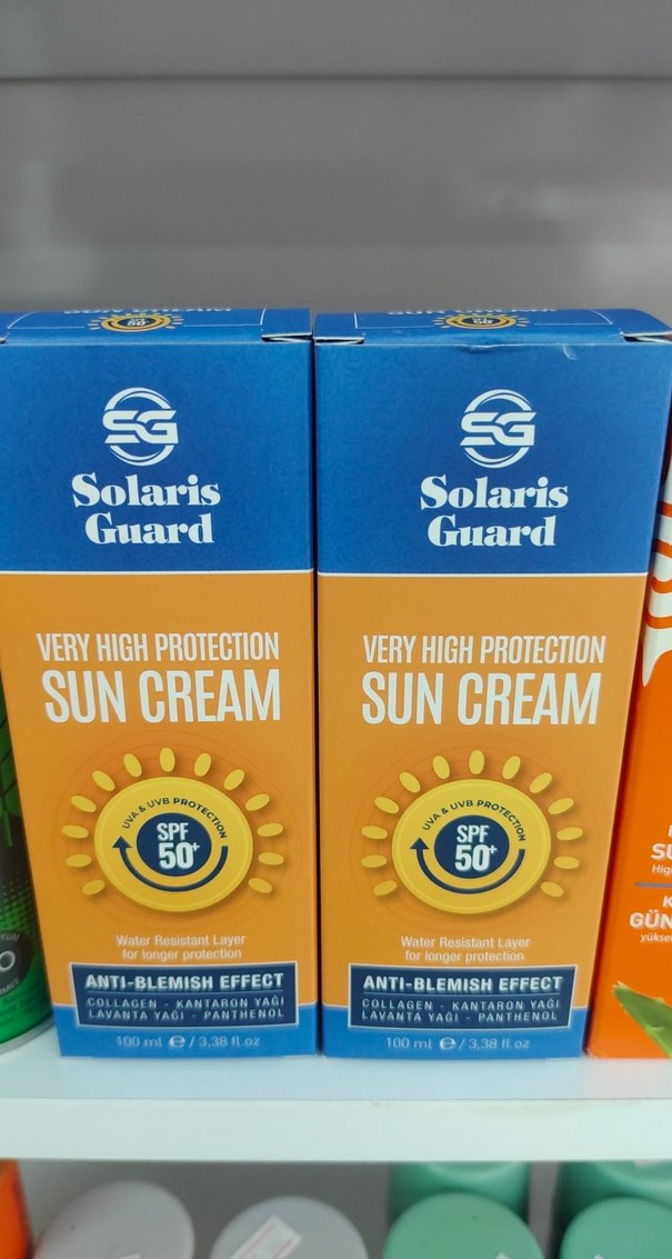 Solaris Guard güneş kremi SPF 50 ile çok yüksek koruma sağlar. Anti-leke etkili, kolajen, lavanta yağı ve panthenol içerir. Suya dayanıklı, 100 ml.