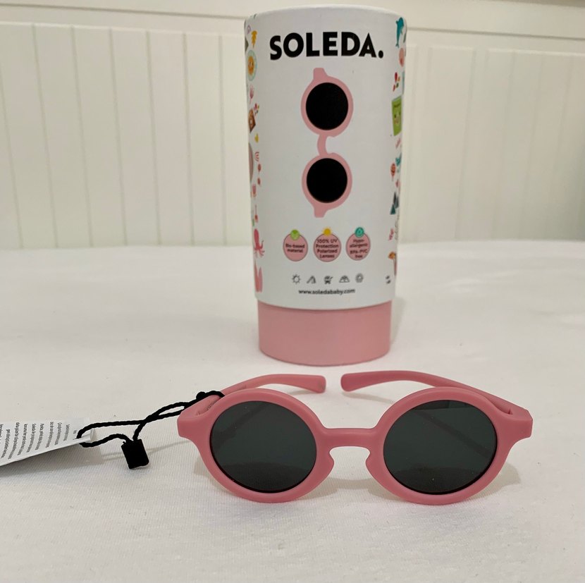 Soleda pembe pastel çerçeveli çocuk güneş gözlüğü, koruyucu koyu lenslere sahiptir. Uyumlu kutuyla birlikte gelir.