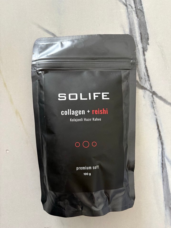 Solife kolajen ve reishi içeren 100g hazır kahve, premium yumuşak bej-gri ambalajda sunulur. ☕