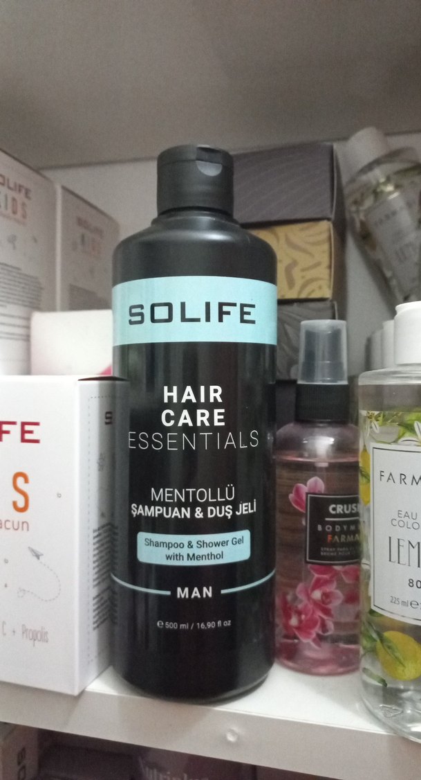 Solife Hair Care Essentials mentollü şampuan ve duş jeli, erkekler için ferahlatıcı mentol etkisiyle temizler. 500 ml şişede sunulur.