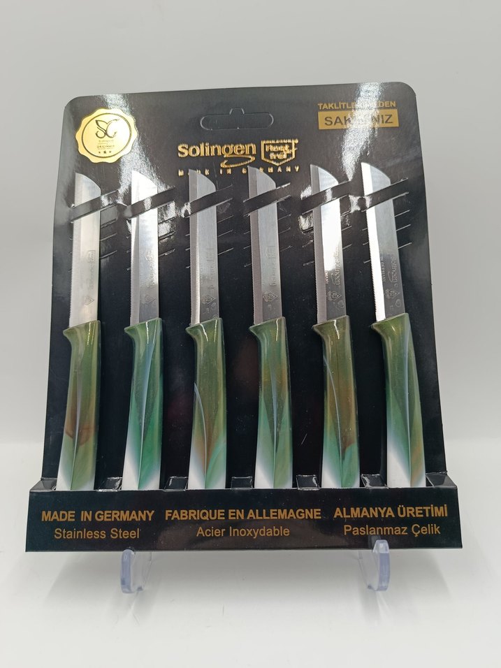 Almanya üretimi Solingen markalı, paslanmaz çelikten 6 adet khaki saplı bıçak seti. Keskin ve dayanıklı bıçaklar içerir. ️