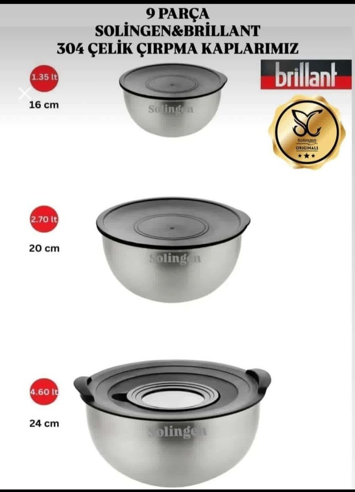 Solingen & Brillant markalı, 16 cm, 20 cm ve 24 cm boylarında, 9 parçadan oluşan gri renkli 304 çelik çırpma kapları seti. Dayanıklı ve kullanışlıdır.