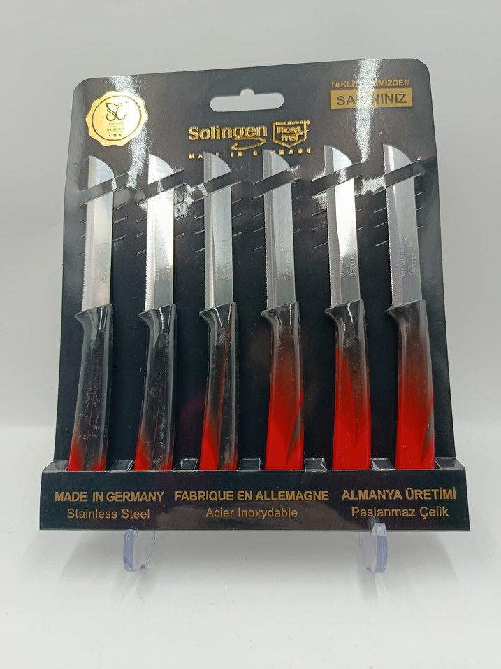 Almanya üretimi Solingen markalı, paslanmaz çelikten 6'lı bordo saplı bıçak seti. Dayanıklı ve keskin bıçaklar.
