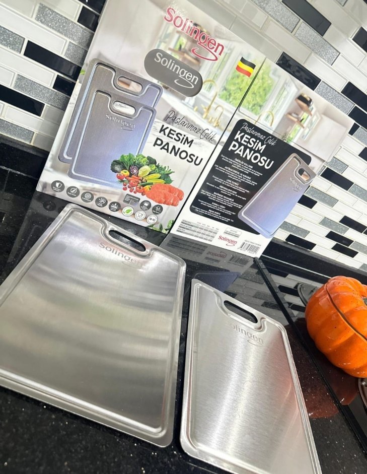 ikili Solingen marka gri kesim panosu, dayanıklı yüzeye ve kolay taşıma için kulpa sahiptir. Yiyecek hazırlamada kullanışlıdır. ️