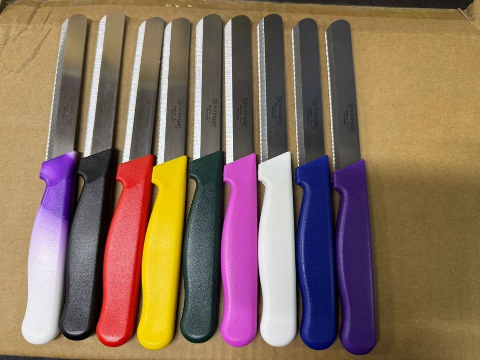 Kırmızı, sarı, yeşil, pembe, beyaz, mavi ve mor renkli saplara sahip bıçak seti. Paslanmaz çelik bıçakları çeşitli kesim işleri için uygundur. orjinal solingendir adet fiyatıdir