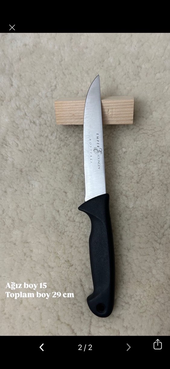Keskin bıçağı ve siyah sapıyla toplam uzunluğu 29 cm olan mutfak bıçağı.