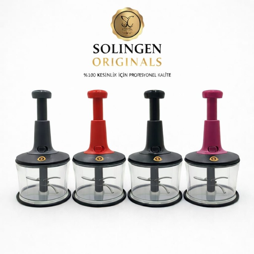 Solingen Originals renkli plastik doğrayıcı, profesyonel kalite ve kesinlik sunar. Şeffaf hazneli, sağlam saplı keskin bıçaklara sahiptir.