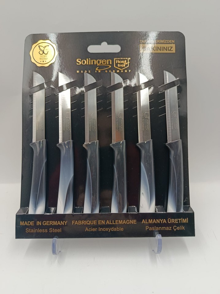 Almanya'da üretilen, paslanmaz çelikten yapılmış, siyah saplı 6 bıçak seti. Dayanıklı ve keskin bıçaklar içerir. ️